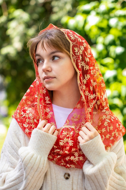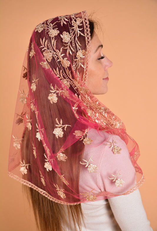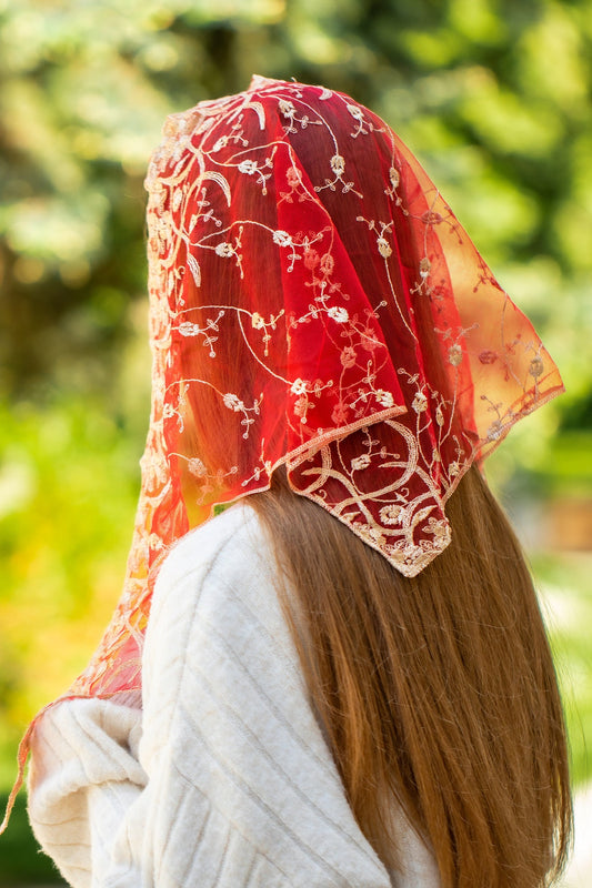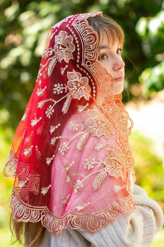 RED VEIL WITH GOLD FLOWERS