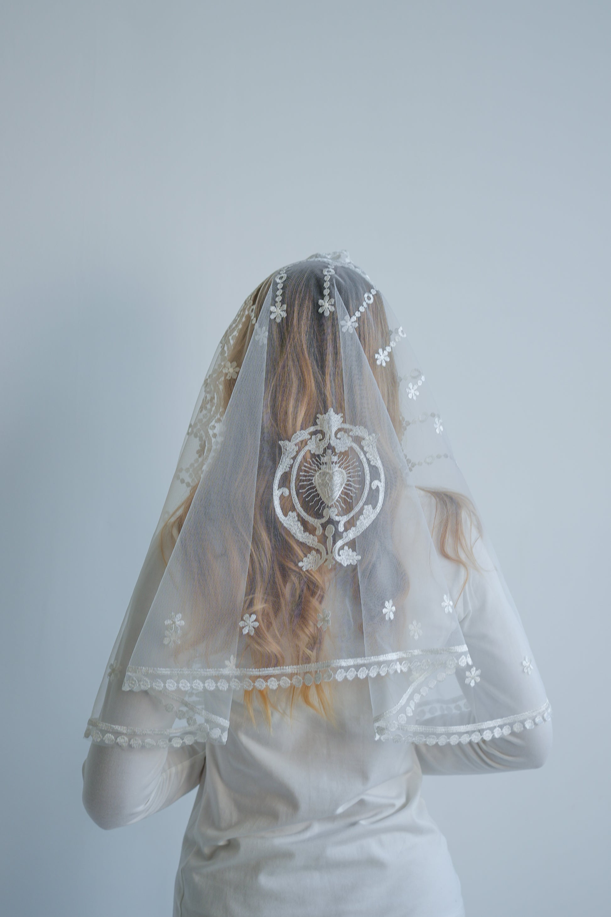 - Long Mantilla with fossil tulle & Ave Maria Embroidery