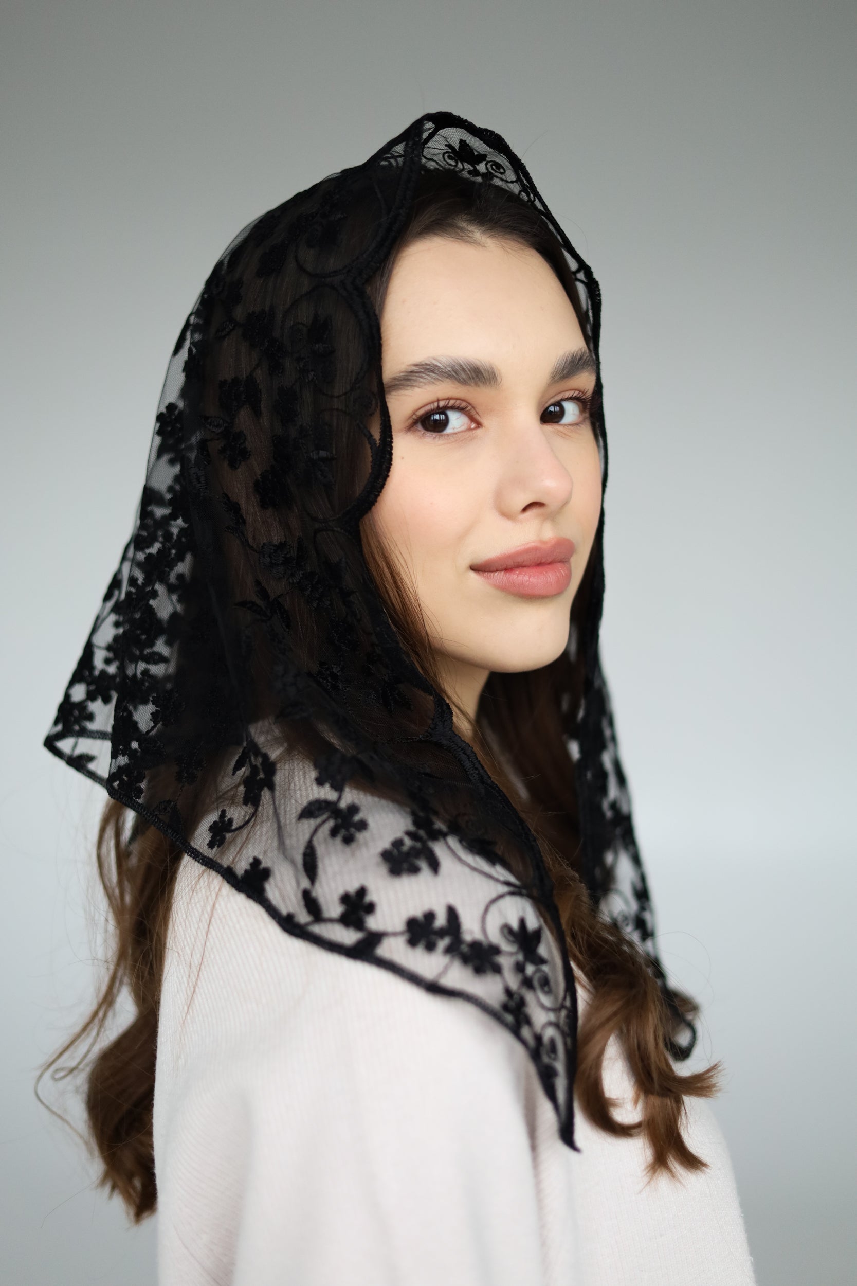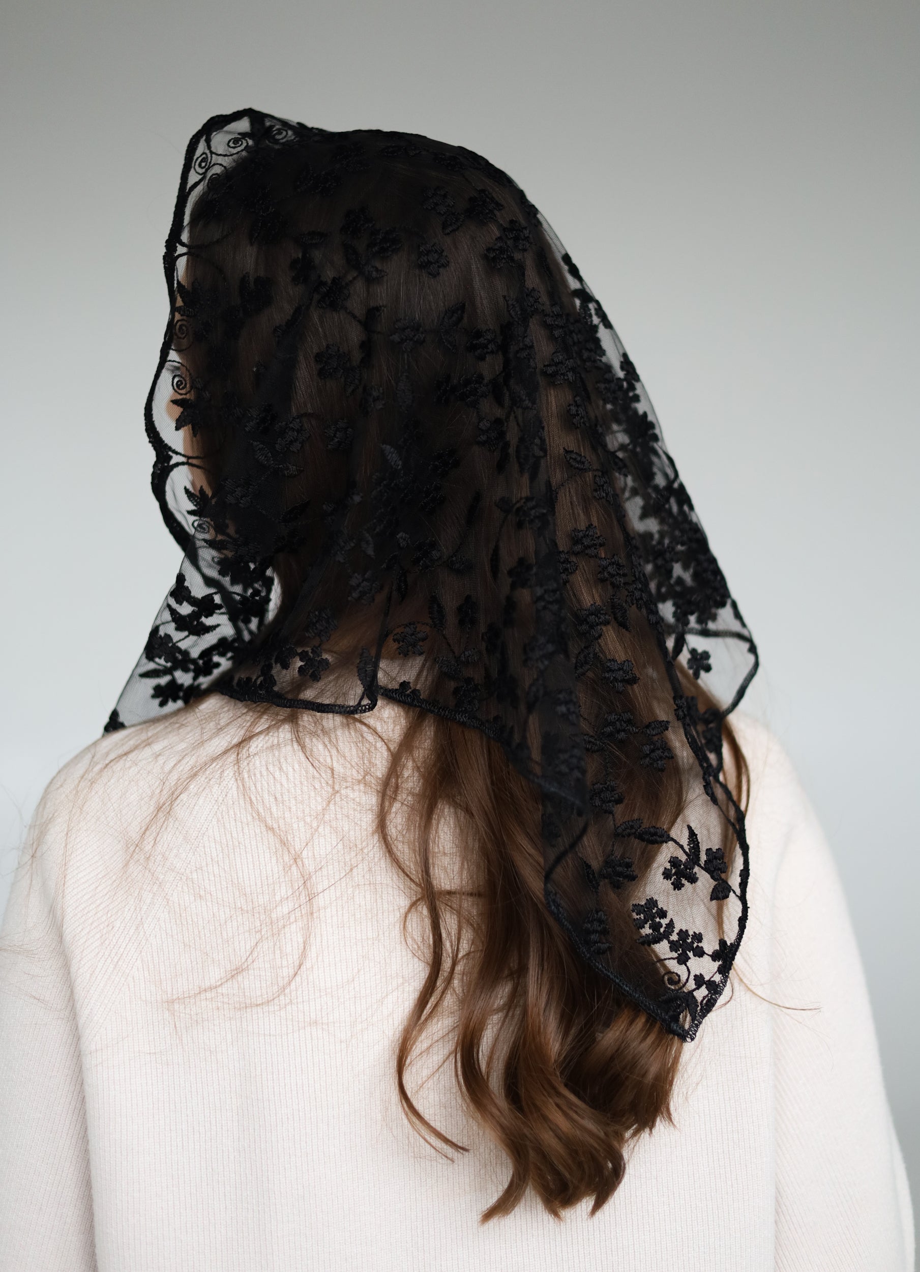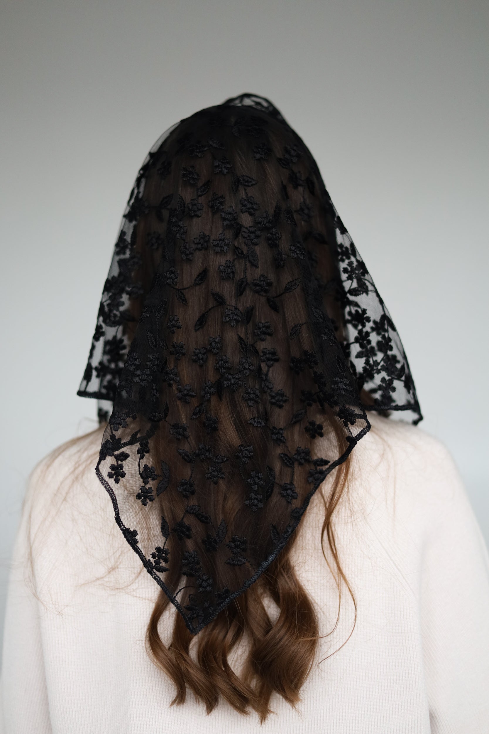 -Short black truangle veil with floral design